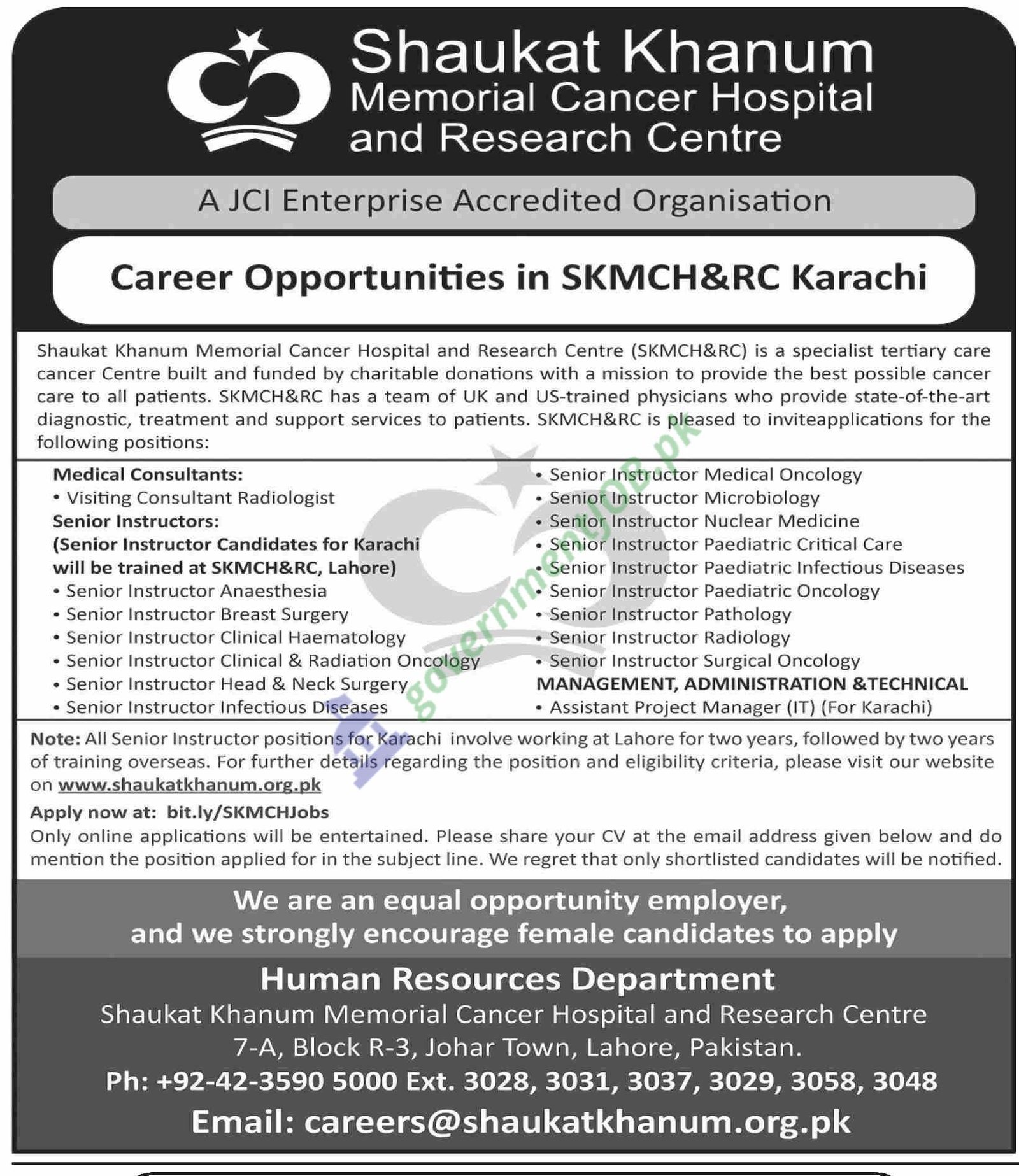Shaukat Khanum Memorial Cancer Hospital and Research Centre (SKMCH&RC) is a very renowned Karachi-based tertiary cancer hospital in Pakistan inviting applications at various posts from experienced administrative and medical professionals. SKMCH&RC offers career opportunities for Visiting Consultant Radiologist and Senior Instructors (Anaesthesia, Breast Surgery, Clinical Haematology, Clinical & Radiation Oncology, Head & Neck Surgery, Infectious Diseases, Medical Oncology, Microbiology, Nuclear Medicine, Paediatric Critical Care, Paediatric Infectious Diseases, Paediatric Oncology, Pathology, Radiology, Surgical Oncology) and Assistant Project Manager (IT).