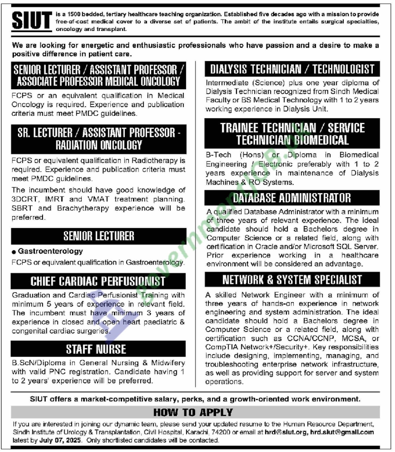 The Sindh Institute of Urology & Transplantation (SIUT) has opened fresh hiring for July 2025, calling on experienced clinicians, nurses, technicians, and IT specialists to add strength to its 1,500-bed facility at Civil Hospital Karachi. Vacancies span Medical Oncology, Radiation Oncology, and Gastroenterology faculty posts (FCPS or equivalent required), as well as a Chief Cardiac Perfusionist, Staff Nurses, Dialysis Technicians/Technologists, and trainee biomedical technicians who can keep RO systems and dialysis machines running smoothly.