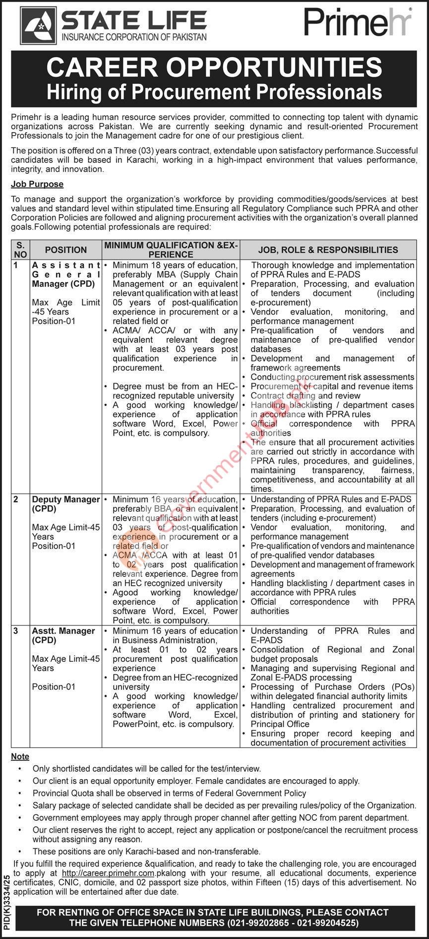 State Life Insurance Corporation of Pakistan, through its recruitment partner PrimeHR, is offering exciting career opportunities in the procurement and supply chain sector for skilled and experienced professionals. These positions are being offered on a contract basis of three (03) years (extendable) and are based in Karachi.
