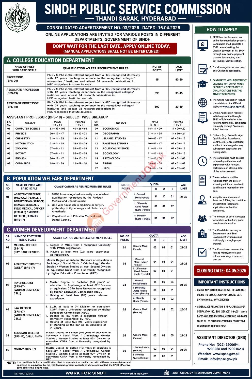 Sindh Public Service Commission (SPSC), Hyderabad has announced multiple Government of Sindh jobs for 2026 through Consolidated Advertisement No. 03/2026 dated 16.04.2026. These vacancies are available in the College Education Department, Population Welfare Department, and Women Development Department. This recruitment drive is ideal for highly qualified candidates seeking teaching jobs, medical officer jobs, psychologist vacancies, law officer positions, and administrative careers in Sindh government departments. Applicants with backgrounds in higher education, medicine, psychology, social sciences, law, and women development services are encouraged to apply, provided they meet the required qualification, experience, age limit, and recruitment rules. All applications must be submitted through the online SPSC application system, and manual applications will not be entertained.