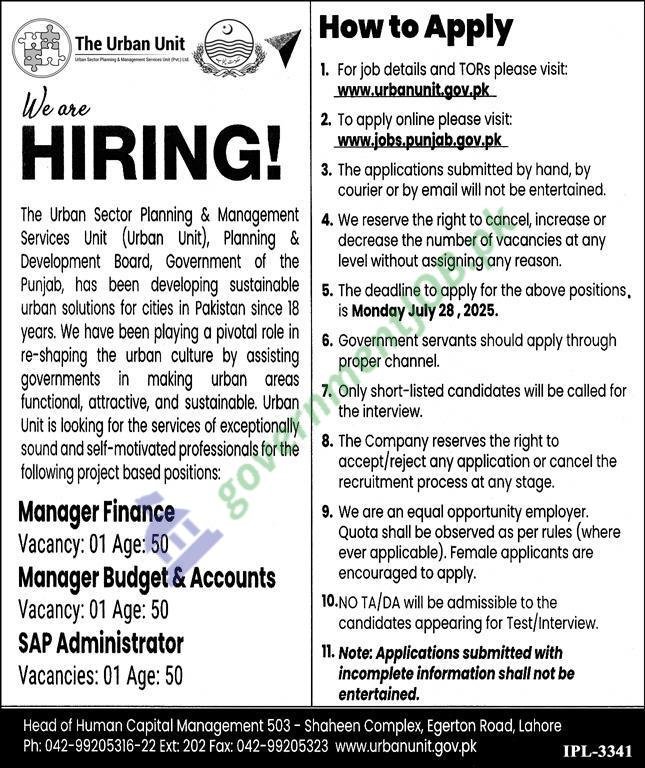 The Urban Unit in Lahore needs three project-based hires—a Manager Finance, a Manager Budget & Accounts, and a SAP Administrator—each open to applicants with a related postgraduate degree (SAP credentials for the last post) who are 50 years or younger; successful candidates will steer the unit’s financial controls or enterprise platform through the next phase of Punjab’s city-planning work. Submit a complete online application at jobs.punjab.gov.pk by Monday, July 28, 2025; hand-delivered or partial files are dropped without review, and only shortlisted applicants will be called for interview, making a thorough, on-time filing essential for anyone ready to handle high-stakes numbers or SAP landscapes in the public sector.