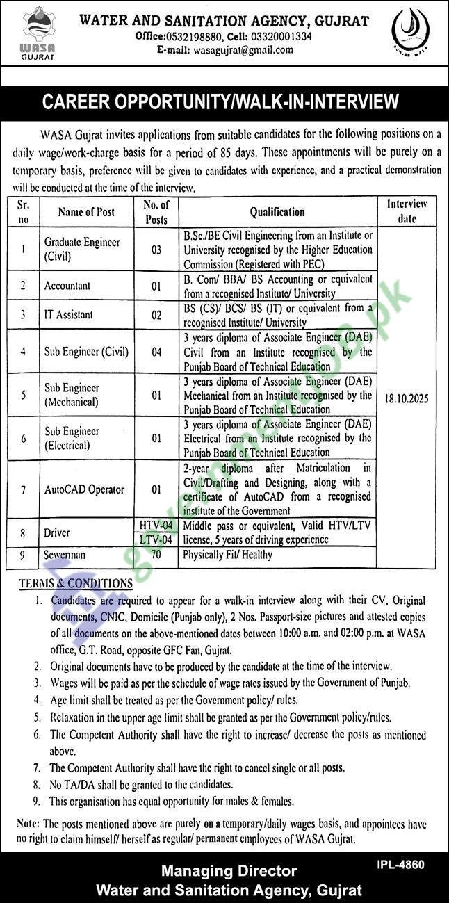 WASA Gujrat Jobs 2025 — Walk-in Interviews (Graduate Engineer Civil, Accountant, IT Assistant, Sub Engineers, AutoCAD Operator, Drivers & Sewermen)
