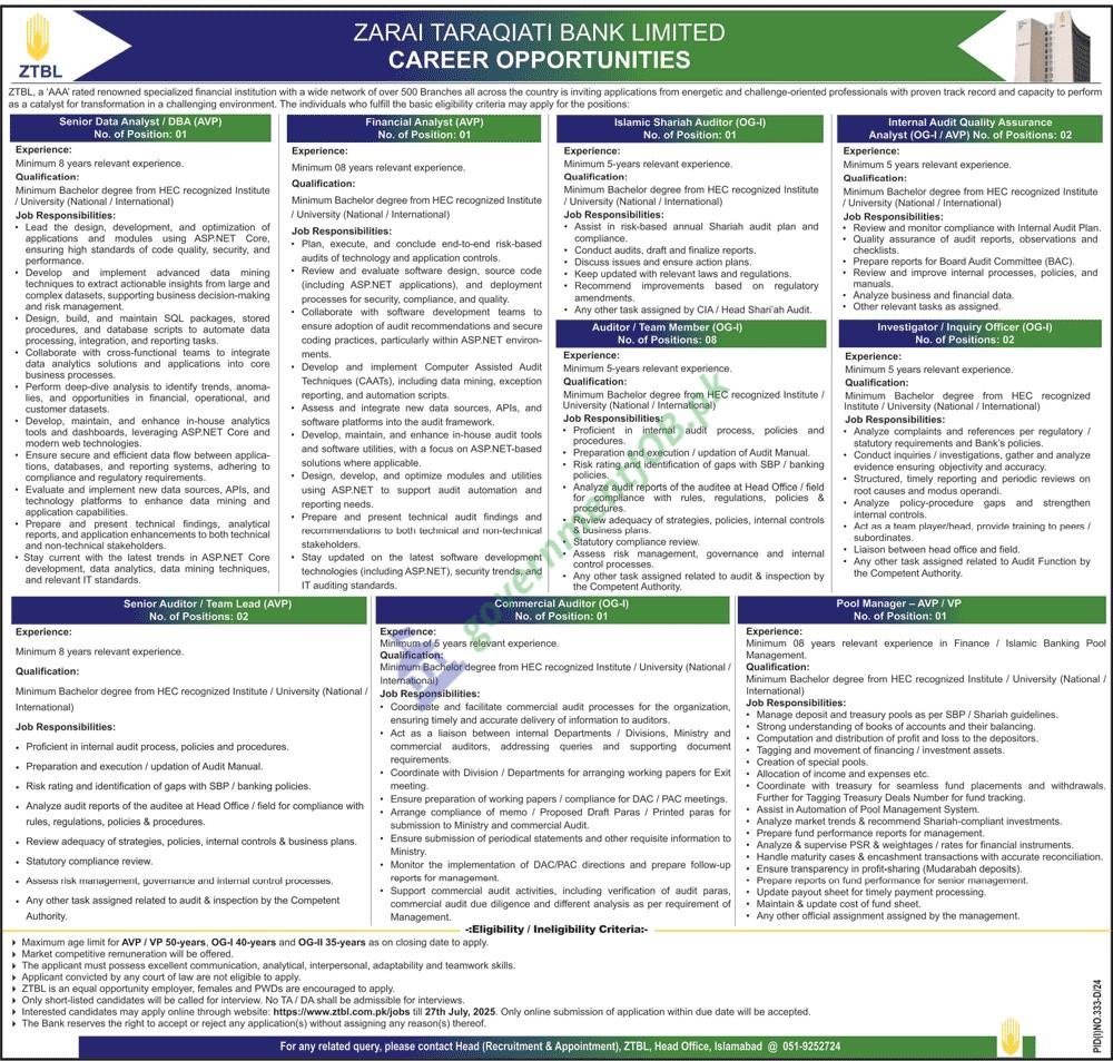 Zarai Taraqiati Bank Limited’s latest round of hiring puts nine mid- to senior-tier posts—from AVP Senior Data Analyst/DBA and Financial Analyst to an Islamic Shariah Auditor, internal-audit leads, branch auditors, an Inquiry Officer, and a Pool Manager-Credit (AVP/VP)—on the table for seasoned bankers who can prove 5-8 years of hands-on work in data, risk, Islamic compliance, or credit operations. Successful applicants will anchor ZTBL’s drive to tighten audit quality, sharpen analytics, and upgrade credit governance across a 500-branch network while headquartered in Islamabad. Eligibility starts with a bachelor’s from an HEC-recognised university, deep familiarity with SBP rules, and toolkits that range from ASP.NET-based BI to Shariah-audit frameworks.