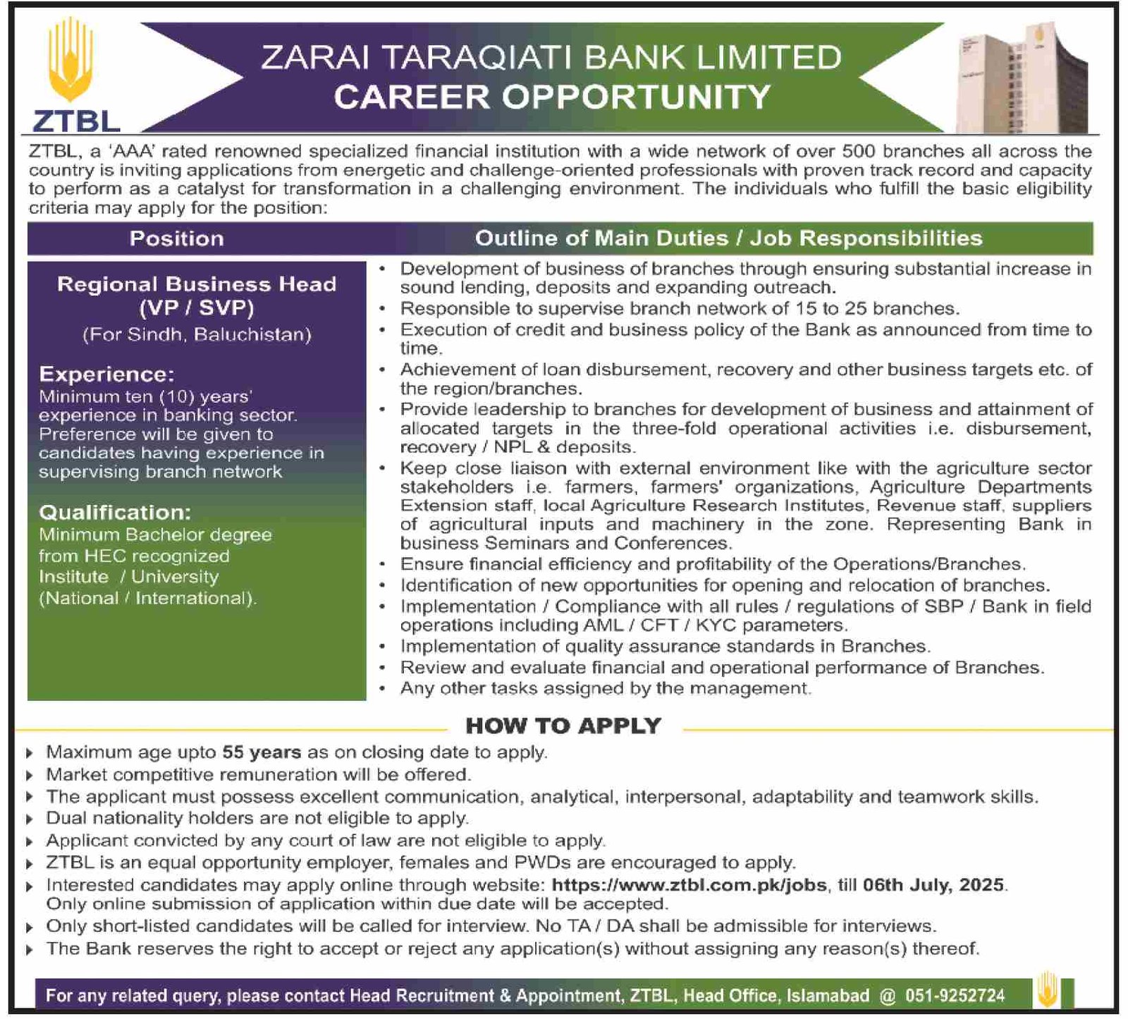 Apply online at www.ztbl.com.pk/jobs by 6 July 2025, uploading your CV, CNIC, degrees, photo, and experience proofs. Only complete, on-time applications will move to the interview stage; anyone ever dismissed for misconduct or convicted by a court is ineligible. For help, call 051-9252724 (Head Recruitment & Appointment, ZTBL Islamabad).