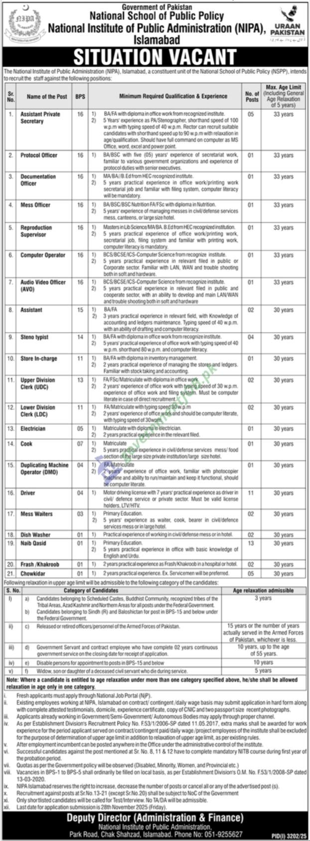 National Institute of Public Administration (NIPA), a company of Pakistan, has announced a job opening for Mess Waiter in Islamabad. This is a Federal Government position in the other sector. All eligible applicants are advised to apply before November 5, 2025. Only those candidates who are shortlisted during the application process will be contacted and called for an interview. Please carefully review the official job advertisement by National Institute of Public Administration (NIPA) for detailed information on eligibility, experience, and required documentation before applying.
