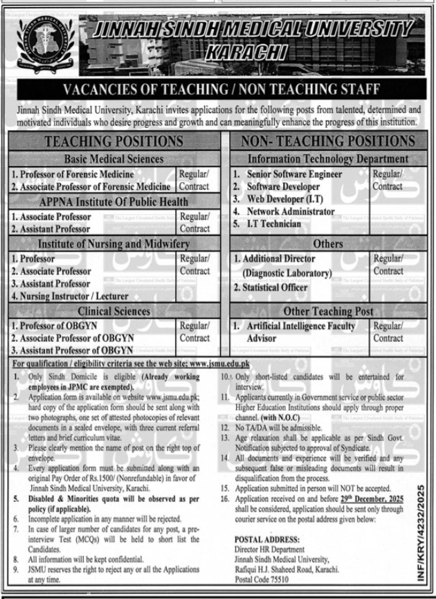 JSMU, a company of Pakistan, has announced a job opening for Software Developer in Karachi. This is a Sindh Government position in the teaching sector. All eligible applicants are advised to apply before December 29, 2025. Only those candidates who are shortlisted during the application process will be contacted and called for an interview. Please carefully review the official job advertisement by JSMU for detailed information on eligibility, experience, and required documentation before applying.